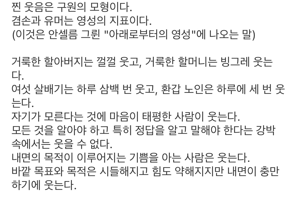 자기가 모른다는 것에 마음이 태평한 사람이 웃는다. 모든 것을 알아야 하고 특히 정답을 알고 말해야 한다는 강박 속에서는 웃을 수 없다.